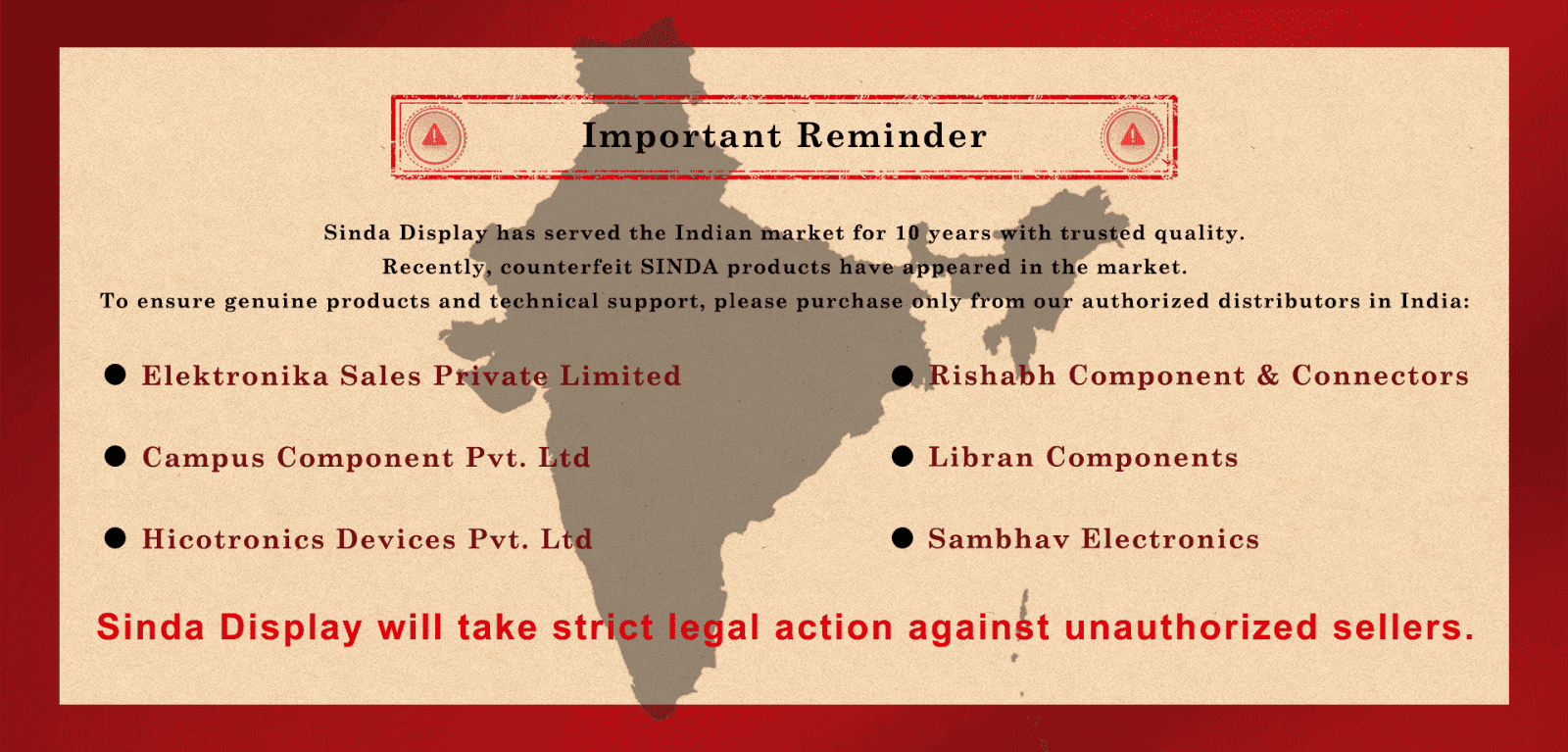 Um sicherzustellen, dass Sie ausschließlich Originalprodukte von SINDA Display erhalten – inklusive umfassender technischer Unterstützung und Qualitätssicherung –, bitten wir Sie, Ihre Einkäufe ausschließlich über die folgenden autorisierten Vertriebspartner in Indien zu tätigen:
